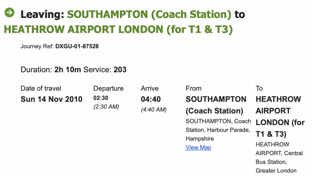 I caught the National Express bus from Southampton Coach terminal (really a tiny brick building with a handful of coach bays. An improvement on the 90s Portakabin) arriving by taxi around 2am, for a 0230 departure. Then, as now, traveling across the Atlantic leaves little change from 24hrs door-to-door.